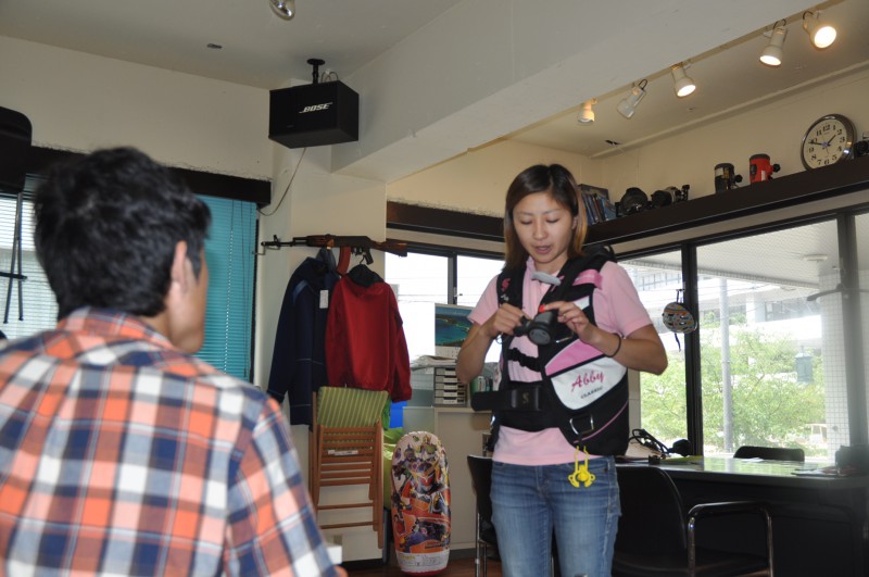 説明を聞いて頂いたら、早速、下に降りて更衣室でウエットに着替えたら、スクーバ器材のセッティング!
