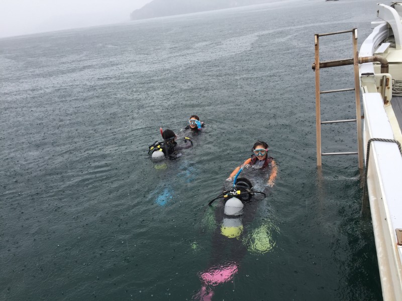 雨が降ってるけど、海の中は降らないからね。(笑)