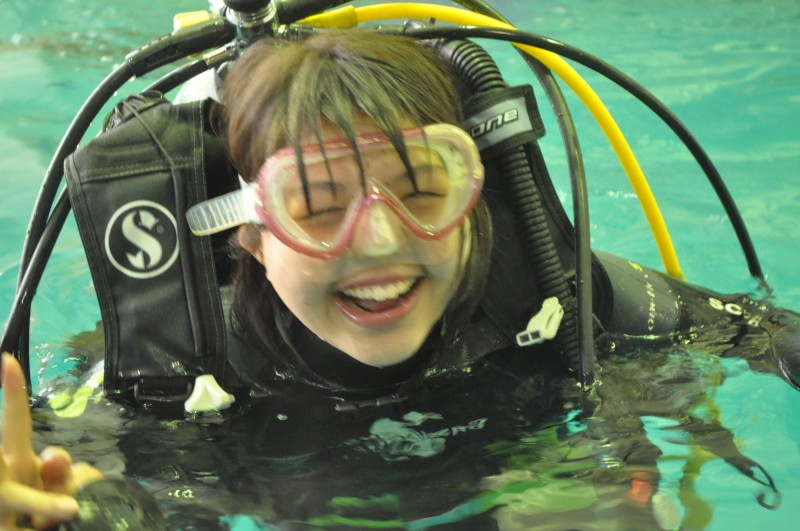 茶話会でお話を聞いてもらって、本日はプールで実際にスクーバダイビングにTRY!!