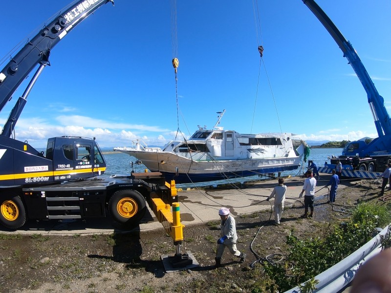 台風の影響で港の中で沈んでしまい、緊急で引き揚げないと燃料が漏れると言う事で最低限の人数で、電話から1時間で現場に駆けつけた。